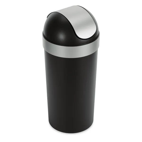 Bei diesem großen, benutzerfreundlichen Mülleimer trifft Stil auf Funktionalität. Mit eleganten Akzenten aus gebürstetem Metall, einem unkomplizierten Schwingdeckel und einem integrierten Halsring sorgt Venti dafür, dass Ihr Abfall nicht zu sehen ist. Der Venti Mülleimer ist robust, stabil und aus langlebigem schwarzem Polypropylen gefertigt, das schnell mit einem feuchten Tuch abgewischt werden kann. Der Venti Mülleimer ist 89 cm hoch, hat einen Durchmesser von 37 cm und ein Fassungsvermögen von 62 Litern. Er funktioniert mit Müllbeuteln mit einem Fassungsvermögen von 75 bis 90 L, einschließlich Beuteln mit Kordelzug. Venti ist groß genug, sodass der Müllbeutel nicht ständig gewechselt werden muss, aber kompakt genug, um in fast jeden Raum in Ihrem Zuhause zu passen.
