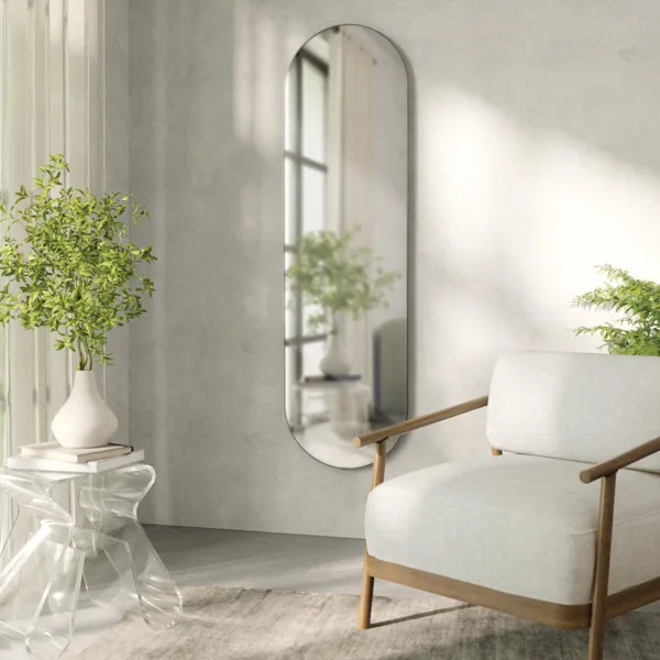 Der Hubba Pill Spiegel verleiht Ihrem Raum mit seinem unverwechselbaren länglichen Design Höhe und Helligkeit. Mit einer Höhe von 157 cm ist er perfekt, um Ihr Outfit von Kopf bis Fuß zu überprüfen und dient gleichzeitig als auffälliges Wandelement. Sein schlanker Metallrahmen verleiht Ihrem Zuhause einen Hauch von Glanz, ohne Ihre Einrichtung zu überwältigen, sodass er problemlos in Schlafzimmer, Eingangsbereiche oder Wohnbereiche passt. Die reflektierende Oberfläche öffnet kleinere Räume auf natürliche Weise und verstärkt das natürliche Licht für ein frisches, einladendes Gefühl. Maße: 45 x 157 x 5 cm. Einfach zu montieren, wird mit allen erforderlichen Montageteilen geliefert.