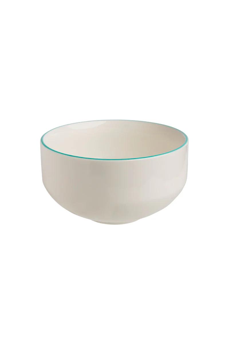 Our bowl with a subtle turquoise rim and purist design combines timeless elegance with modern simplicity. Made from high-quality porcelain, it impresses with its smooth surface and clear, unobtrusive shape, which fits perfectly into minimalist table concepts. The fine stripe that adorns the top edge of the bowl adds a subtle touch of colour and harmonises perfectly with the white interior and exterior. Its versatile size makes it ideal for muesli, soups, desserts or snacks. With its simple yet stylish aesthetic, the bowl blends effortlessly into modern table arrangements and is also a practical everyday companion. Complete your style with our favourite pieces from the TINTED GRACE range.