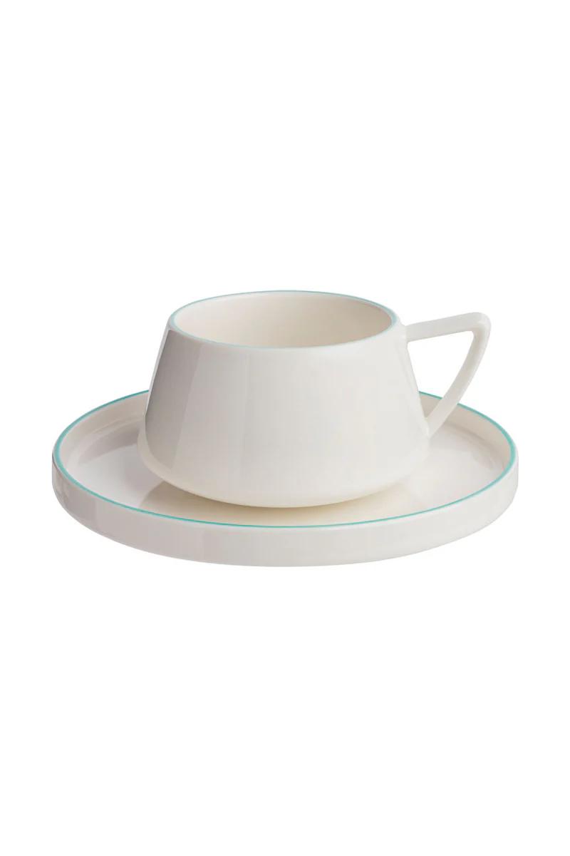 Our cup with saucer and a subtle turquoise rim combines modern design with purist elegance. Made from high-quality porcelain, it impresses with its clear lines and smooth, timeless surface. The mug impresses with its simple, geometric shape, which combines an angular style with modern sophistication. The fine stripe at the top of the cup and along the edge of the saucer creates a harmonious accent and emphasises the minimalist design. The perfectly matching saucer offers enough space for spoons or small garnishes and completes the set to create a stylish overall look. With its ideal size, the cup is perfect for coffee, tea or hot drinks and creates an elegant highlight on any table. Complete your style with our favourite pieces from the TINTED GRACE range.